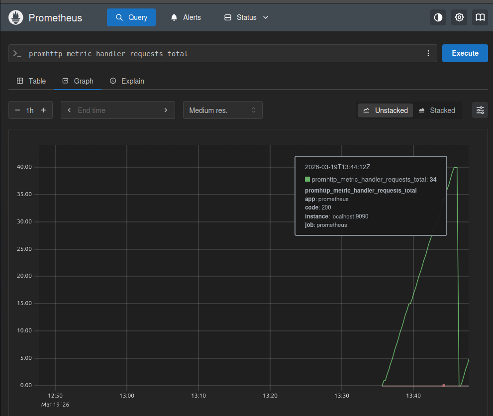 By postawić kropkę nad i proponuję zrestarrtować system i odświeżyć stronę Prometheusa. Ujrzymy na wykresie nie tylko restart usługi: